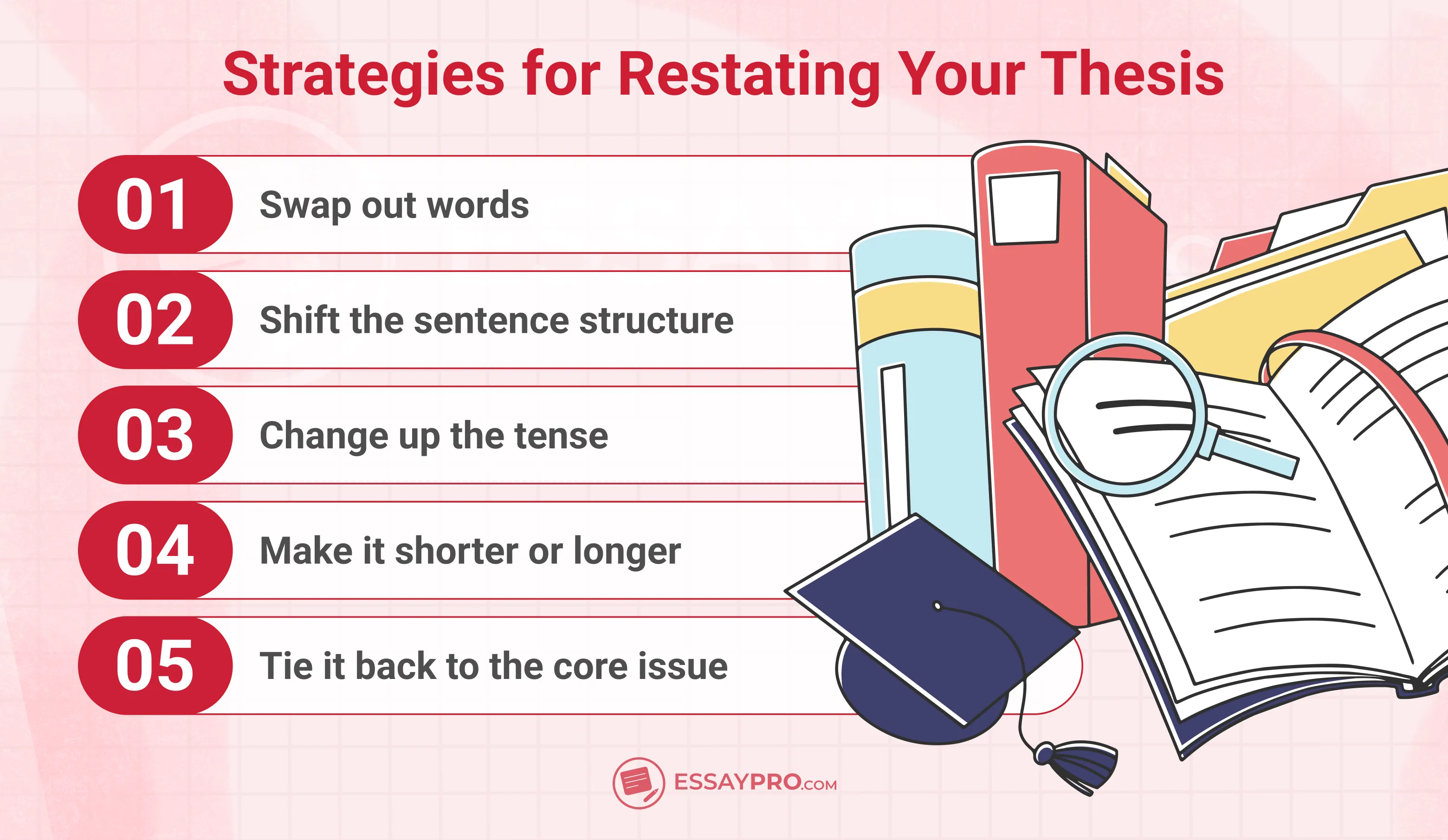 Sometimes, all it takes is a little shift in words or structure to write a restated thesis and make it feel new again. Have a quick look at the simple steps: