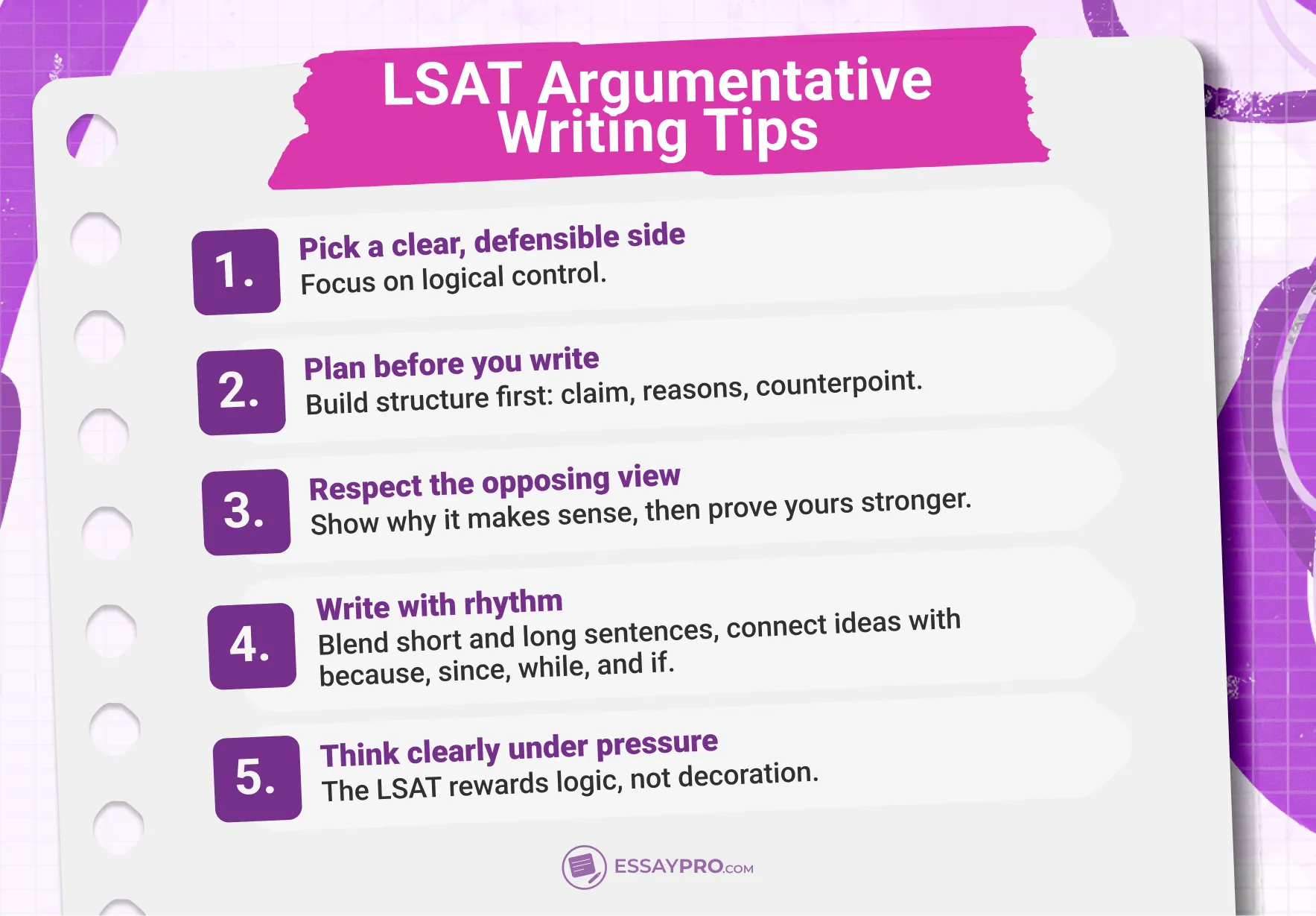 - Start with structure before sentences: Each LSAT argumentative writing starting point is structure. Lead with a clear claim, stack two or three reasons beneath it, then leave space for a counterpoint.