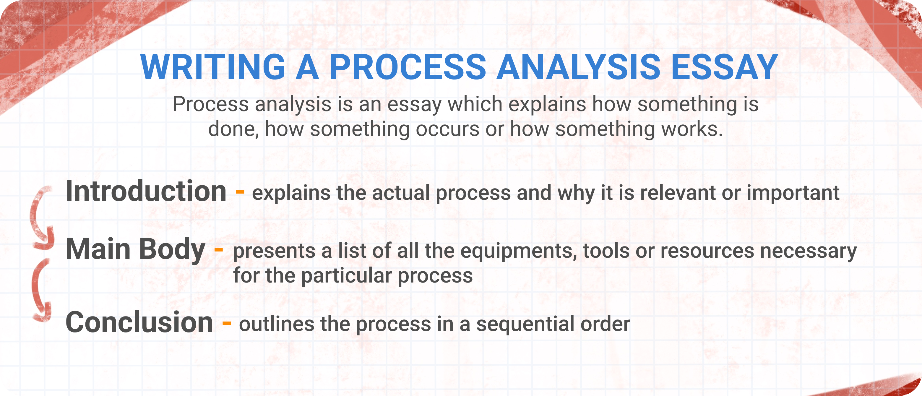 Before jumping to the How To section, let’s answer the question of what is process analysis. Process analysis is an essay which explains how something is done, how something occurs, or how something works. In this type of essay, the writer is required to present the steps of the process in sequential order, from first to last. All concepts or terms that might appear uncommon are defined.